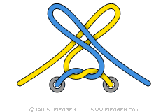 Pasar ambos cabos por el hueco en el medio. El lazo derecho (amarillo) debe salir por atrás y el lazo izquierdo (azul) debe salir por delante.