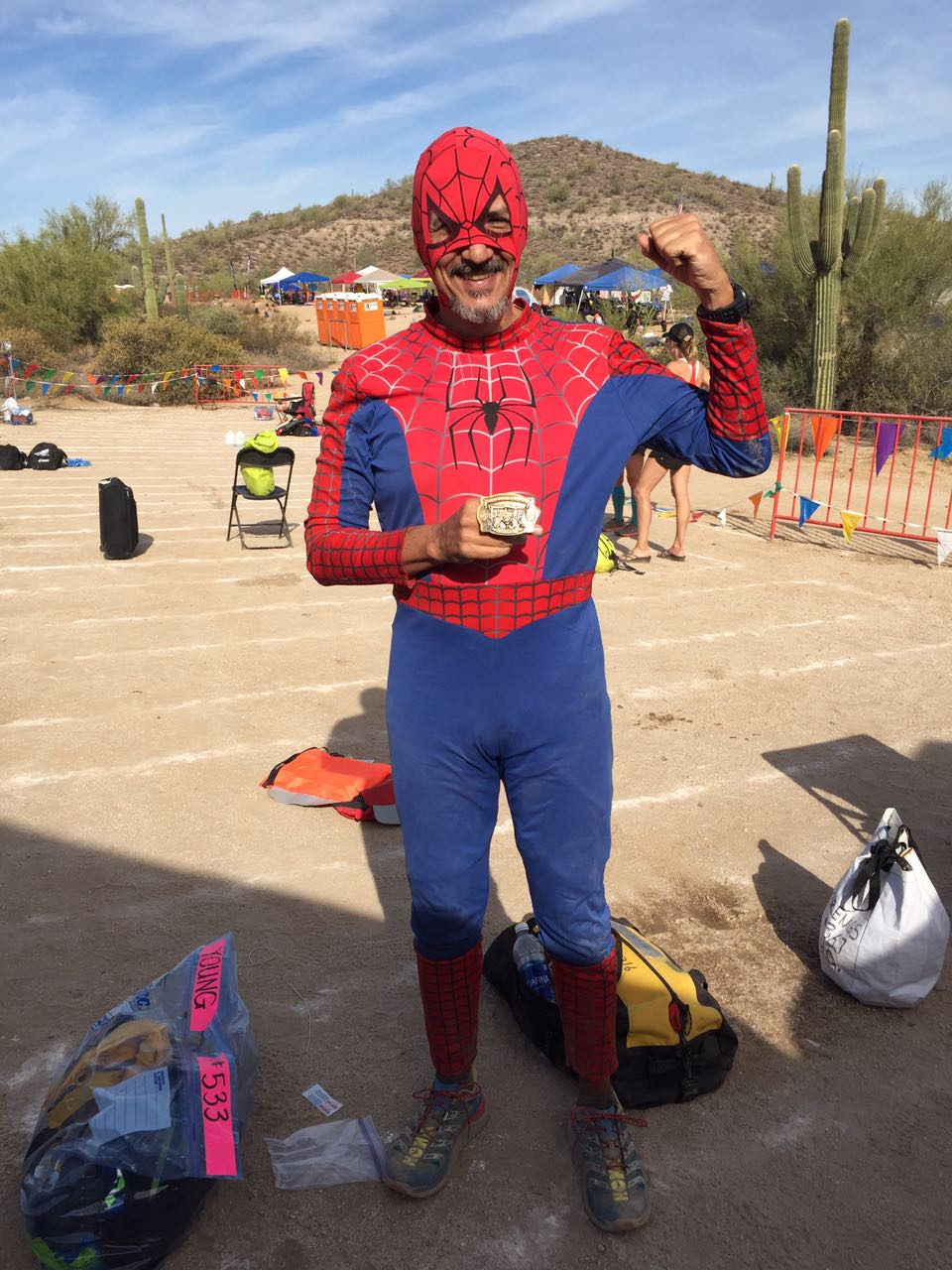 Este último fin de semana de octubre corrí Javelina Jundred 100 millas en 25:58:54, mi mejor tiempo hasta ahora en las cien millas. Con esta carrera conseguí mi séptima hebilla de ultra corredor. Después de haber corrido Javelina en el 2010, mejoré el tiempo de esta carrera en 2:50 (casi tres horas) y volví a correr vestido de Hombre Araña, como lo hice aquella vez. Diría que la experiencia me permitió mejorar mi tiempo porque no creo que esté corriendo con la misma fuerza y velocidad que tenía a mis 49 años (de eso estoy seguro).